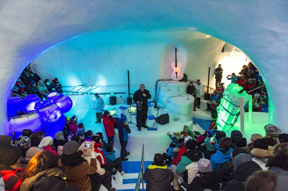 L’idea di costruire un teatro di ghiaccio in cui eseguire musica suonata con strumenti dello stesso materiale è dell’artista americano Tim Linhart, protagonista di una storia affascinante. Cresciuto nella periferia americana e appassionato artefie di sculture di ghiaccio, da ragazzo ha cominciato a proporle ai gestori degli impianti di sci per pagarsi lo skipass che non poteva permettersi di pagare. La sua maestria si è affinata al punto da portarlo a scolpire strumenti musicali, non solo belli da vedere, ma soprattutto in grado di suonare. E alla fine è arrivato anche un Ice Dome, nel quale allestire concerti in cima alle vette più alte. Spiega Tim: “Salire su una montagna di notte è già abbastanza avventuroso. Entrare in una sala concerto all’interno di un igloo è come entrare in una discoteca in paradiso: l’orchestra di ghiaccio e le mura scintillano e risplendono, irradiando i fluidi colori dell’arcobaleno”.