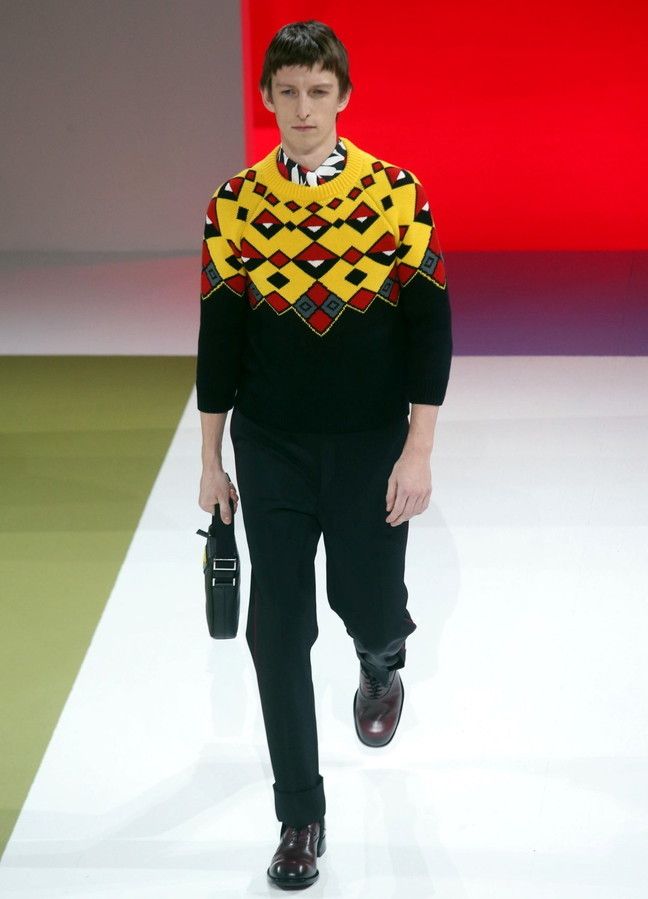 PRADA, IL “SURREALISMO CLASSICO” – Il classico, ovvero tutti quei capi che fanno da sempre parte del guardaroba maschile: il maglione di lana, i cardigan, i gilet, i cappotti. Accompagnato all’elemento surrealista, come anticipa al pubblico della sfilata l’allestimento che riproduce due piazze di ispirazione metafisica, deserte, stranianti. Prada ha presentato così una collezione dalle forme grafiche, piatte, quasi esagerate. Una spinta al rinnovamento, per porsi delle domande e non stancarsi di cercare risposte.