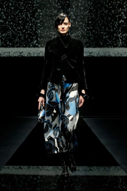 UNO STILE COERENTE E IN CONTINUA EVOLUZIONE - Maschile e femminile si uniscono in un nuovo equilibrio, riaffermando l’essenza di uno stile coerente e in continua evoluzione. I galloni, le nervature di divise da eroe letterario, ma anche i cappotti avvolgenti, le giacche piccole dalle abbottonature alte e i pantaloni alla zuava infilati dentro gli stivali, sono riletti al femminile, ammorbiditi, ingentiliti. Anche il camouflage è una composizione astratta e scintillante di fiori e petali, mentre la divisa perde l’aplomb marziale per suggerire un contegno aggraziato. Il velluto nero segna il movimento e lo ritma in una silhouette fluida, dalle spalle decise. Piccole giacche, pastrani, pantaloni dritti, soprabiti di maglia, indossati con le scarpe piatte o gli stivali e accompagnati da borse di forma geometrica, disegnano una progressione che di sera lascia spazio ai lunghi abiti scintillanti. Domina il nero, luminoso invece che notturno, punteggiato da ampi tocchi di rosa, verde acqua, grigio perla. In conclusione della sfilata, un pensiero rivolto alla Cina, Paese con il quale lo stilista ha da sempre un legame speciale, estetico e culturale. In passerella, una selezione di look delle collezioni Giorgio Armani Privé primavera/estate 2009 e 2019, che proprio alla Cina erano ispirate.