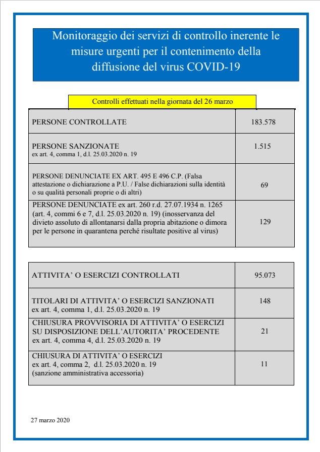 I controlli delle forze dell'ordine anche prima del nuovo decreto hanno portato a una sfilza di denunce, per inosservanza dei provvedimenti amministrativi. Dal gruppo di persone trovato in piazza a fumare spinelli, a chi andava a fare una passeggiata nel paese vicino. Dati che sottolineano come siano ancora molti gli irresponsabili che non abbiano compreso la gravità dell'epidemia che sta mettendo a dura prova il nostro sistema sanitario.