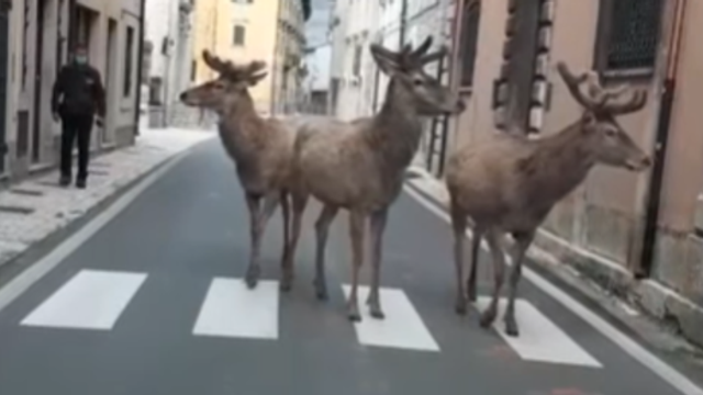 Tre splendidi esemplari di cervo passeggiano tranquilli e indisturbati tra le vie deserte. E' accaduto a Villetta Barrea, in provincia de L'Aquila. Il video, pubblicato dalla pagina Facebook Visit Abruzzo, riprende il momento in cui un uomo prova a farli allontanare, ma loro non sembrano dargli retta.
