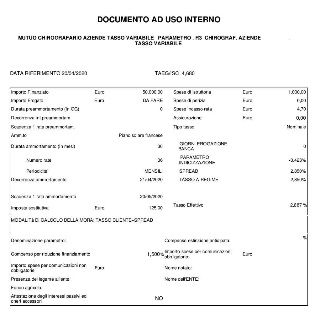 Un imprenditore con un fatturato di circa un milione di euro ha chiesto nei giorni scorsi a una delle più importanti banche italiane un prestito da 50mila euro. Quello che emerge è una procedura di richiesta di liquidità di emergenza che si presuma possa essere piuttosto frequente, dato il periodo, e che prevede mille euro di spese di istruttoria della pratica, uno spread di poco inferiore al 3% e 4 euro di spese incasso rata ogni mese. Il tutto per un tasso di interesse complessivo TAEG/ISC al 4,68%.