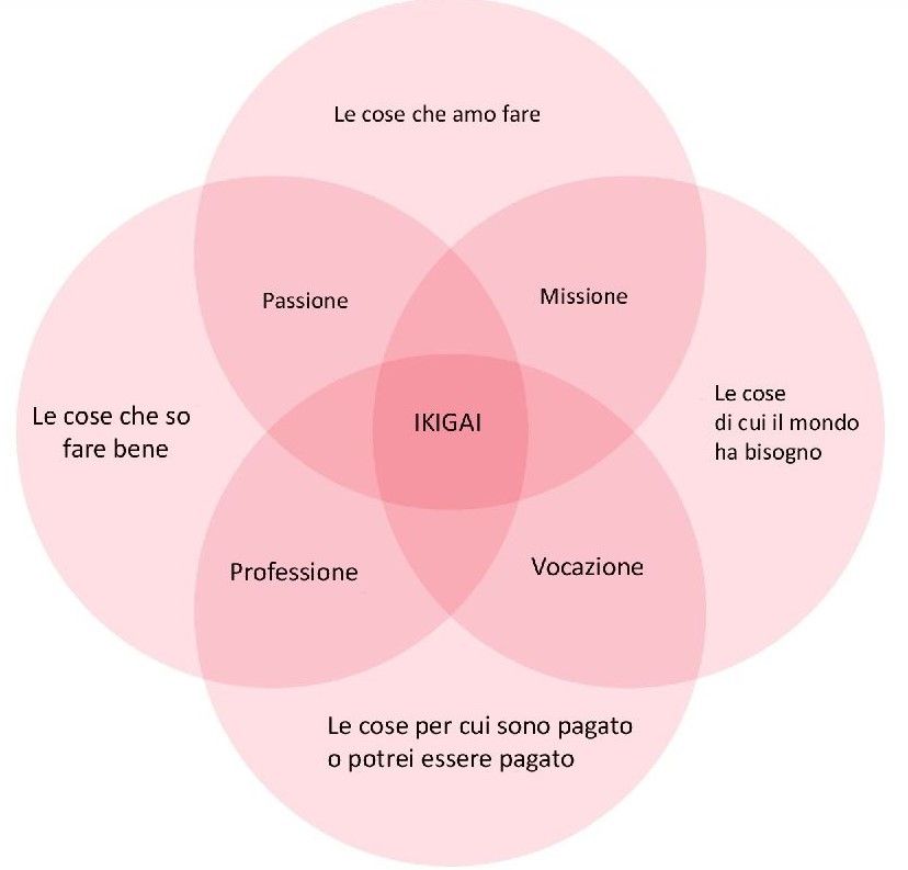 COME SI LEGGE LA MAPPA IKIGAI – l’Ikigai è il punto interiore in cui si incrociano diversi aspetti: quello che amiamo fare, quello siamo bravi a fare, ciò di cui il mondo ha bisogno, quello che ci permette di guadarci la vita. Dall’incrocio tra questi aspetti nascono quattro aree di intersezione e sovrapposizione: passione, ovvero ciò che amiamo e siamo bravi a fare; professione, ovvero ciò in cui siamo bravi e per cui veniamo pagati; vocazione, ossia ciò per cui siamo pagati e di cui il mondo ha bisogno; e infine missione, quello di cui il mondo ha bisogno e che amiamo fare. Per avvicinarci al nostro Ikigai, punto in cui tutte queste sfere si uniscono, dobbiamo cominciare a mettere insieme almeno tre di questi aspetti. Dobbiamo anche ricordare che questo cammino richiede esperimenti, perseveranza e un po’ di sacrificio. Occorre sperimentare nuove cose, per scoprire che cosa ci piace; ci vuole impegno e lavoro per diventare bravi nel nostro campo e per arrivare a farci pagare per quello che amiamo fare. A quel punto dobbiamo chiederci come il nostro contributo può aiutare a migliorare il mondo intorno a noi. Il punto fondamentale è che l’esplorazione di questi aspetti e il passaggio dall’uno all’altro devono avvenire in piena spontaneità e senza forzature.
