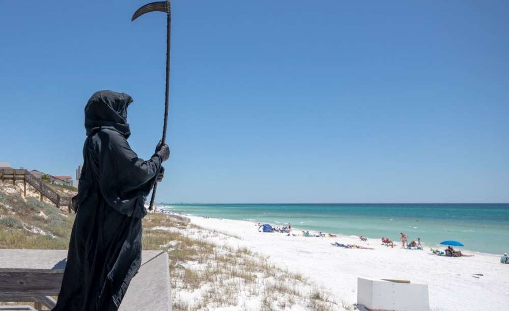 Un abito e un mantello nero, una falce in mano e il volto coperto. Così Daniel Uhlfelder, un avvocato americano, si è presentato sulle spiagge della Florida per lanciare agli abitanti del Paese il suo messaggio inquietante ma realistico: il virus è ancora forte, restate a casa e non uscite. Permettere agli abitanti, ancora in piena pandemia, di andare al mare, è un grave errore, avverte Uhlfelder.