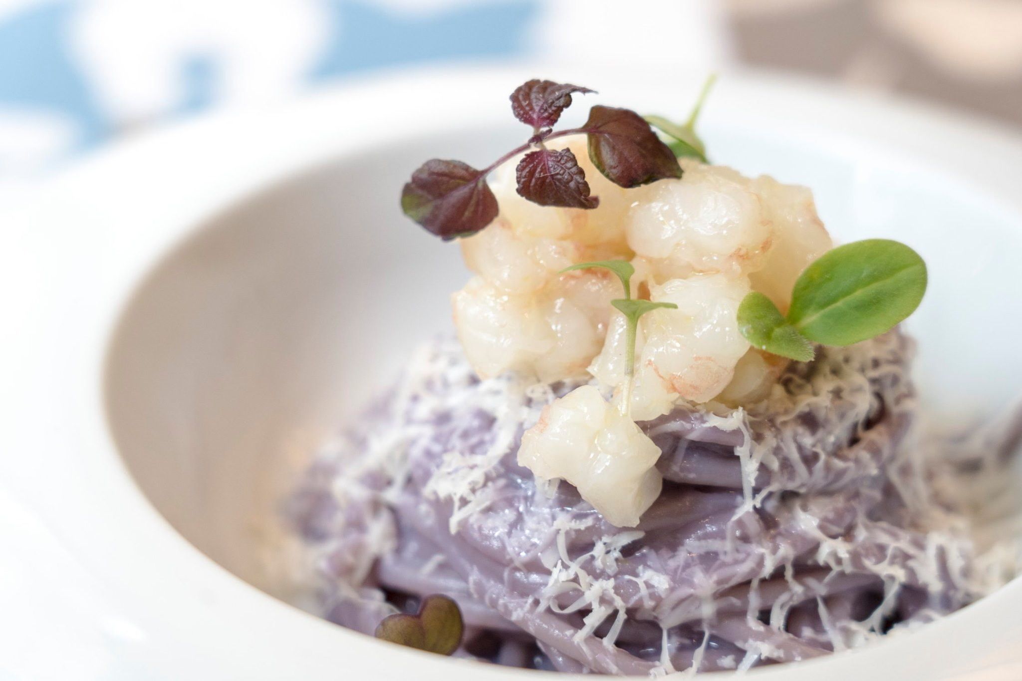 Spaghetti alla centrifuga di cavolo viola, bergamotto cacioricotta di capra e scampo crudo