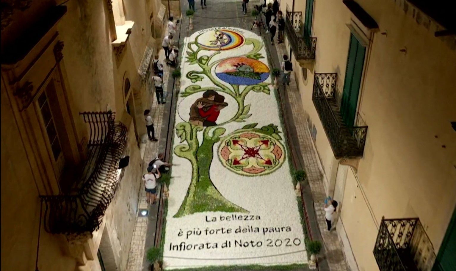 “La Bellezza è più forte della paura e questo Noto l'ha sempre dimostrato”: all’insegna di queste parole, pronunciate in streaming da Beppe Fiorello, si è svolta sabato 16 maggio l’edizione speciale dell’Infiorata di via Nicolaci, a Noto, il comune gioiello del barocco siciliano in provincia di Siracusa. Gli instancabili infioratori hanno realizzato un’Infiorata simbolica, come segnale di ripartenza e resilienza, con un grande arazzo fiorito sulla pavimentazione della storica via Nicolaci che si è coraggiosamente vestita a festa, anche senza che la festa potesse svolgersi. Il momento clou dell’evento è stato in compagnia del cantautore Mario Incudine, il quale ha passeggiato per le vie deserte del centro storico, Patrimonio Mondiale dell’Umanità dall’Unesco, offrendo ai cittadini chiusi in casa e agli spettatori in diretta streaming il suo “Cunto” speciale di amore e resilienza per Noto, la Sicilia e il mondo intero, accompagnato dal suono della chitarra e dei tamburi tradizionali.