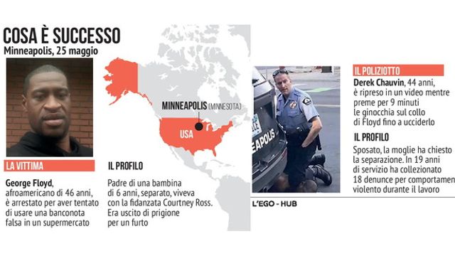 George Floyd, 46enne afroamericano di Houston, viveva in un sobborgo di Minneapolis da cinque anni ed era un addetto alla sicurezza di ristorante chiuso durante l'emergenza Covid-19. Lunedì 25 maggio è stato arrestato dalla polizia per il sospetto uso di una banconota falsa da 20 dollari per l'acquisto di sigarette. Diciassette minuti dopo l'intervento degli agenti l'uomo è stato dichiarato morto. In un video diffuso succesivamente viene mostrato l'agente di polizia Derek Chauvin premere il suo ginocchio sul collo di George Floyd per 8 minuti e 46 secondi e gli altri agenti non fare nulla per fermarlo. Il filmato ha scatenato una vera e propria ondata di proteste e indignazione prima a Minneapolis, poi in altre metropoli e città americane.