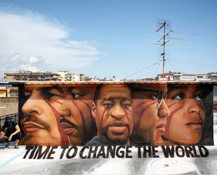 Il volto di George Floyd spunta su un murales sui tetti di Napoli accanto a Martin Luther King, Malcolm X, Angela Davis e Lenin. Lo street artist italo-olandese Jorit ha ritratto l'afroamericano ucciso da un poliziotto a Minneapolis e, per dire basta al razzismo, ha accostato il suo viso a quattro personaggi che della lotta all'odio razziale hanno fatto una delle loro ragioni di vita. Floyd occupa la posizione centrale dell'opera, con lacrime rosse che gli rigano le guance. Il murales, che misura due metri per cinque, sta già facendo il giro del web dopo che qualche drone lo ha catturato "in anteprima".