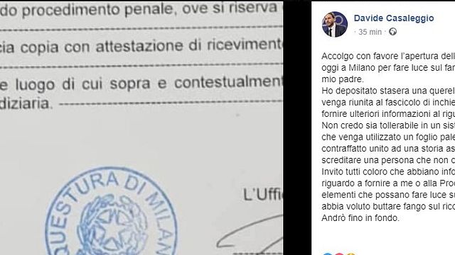 "Non credo sia tollerabile in un sistema democratico che venga utilizzato un foglio palesemente contraffatto unito ad una storia assurda per screditare una persona che non c'è più. Invito tutti coloro che abbiano informazioni al riguardo a fornire a me o alla Procura tutti gli elementi che possano fare luce su chi e perché abbia voluto buttare fango sul ricordo di mio padre. Andrò fino in fondo".