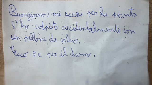 Il biglietto - "Buongiorno, mi scusi per la pianta. L'ho colpita accidentalmente con un pallone da calcio. Ecco cinque euro per il danno", è il contenuto del biglietto scritto a mano e firmato dal bambino.