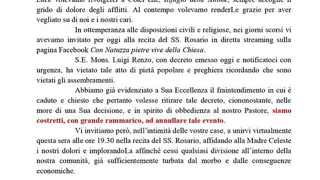 "In ottemperanza alle disposizioni civili e religiose, nei giorni scorsi vi avevamo invitato alla recita del S.S. Rosario in diretta streaming sulla pagina Facebook ‘Con Natuzza pietre vive della Chiesa’ - si legge in un comunicato diffuso dalla Fondazione -. S.E. Mons. Luigi Renzo, con decreto emesso oggi e notificatoci con urgenza, ha vietato tale atto di pietà popolare ricordando che sono vietati gli assembramenti".