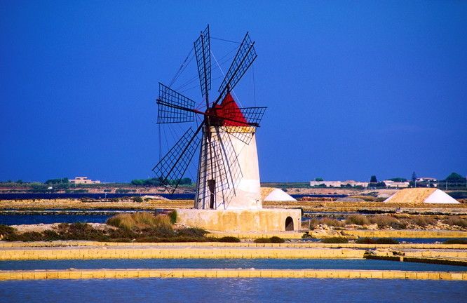 MULINI DELLE SALINE DI TRAPANI E PACECO - La zona delle saline che si estende da Marsala a Trapani, nella Sicilia occidentale, è dominata dalla presenza dei mulini. Sono tra i pochi elementi architettonici presenti in queste aree naturali, protette perché importanti zone umide che offrono riparo a numerose specie di uccelli migratori.