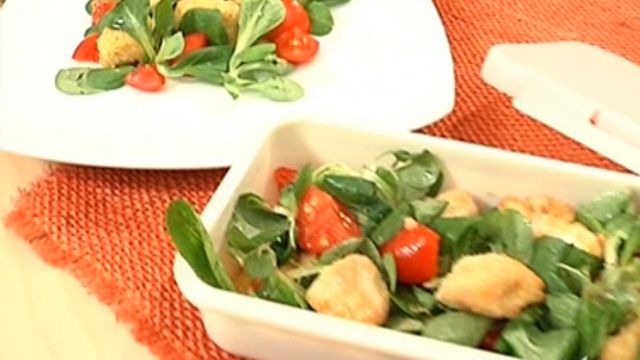 Intanto lavate e asciugate la valeriana. Lavate e tagliate a spicchi i pomodorini. Mettete in una ciotola i bocconcini di pollo, la valeriana e i pomodorini, regolate di sale, condite con olio evo e mescolate.