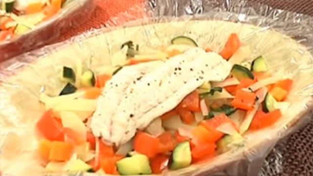 Foderate due pirofile da forno con gli appositi sacchetti, distribuite in ciascuna le verdure e adagiatevi sopra i filetti di pagello.