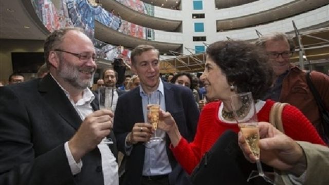 Applausi e un brindisi dei fisici italiani per festeggiare il Nobel vinto con il bosone di Higgs, la particella grazie alla quale esiste la massa teorizzata nel 1964 e scoperta nel 2012 da due esperimenti condotti nel Cern di Ginevra e guidati all'epoca dagli italiani Guido Tonelli e Fabiola Gianotti.