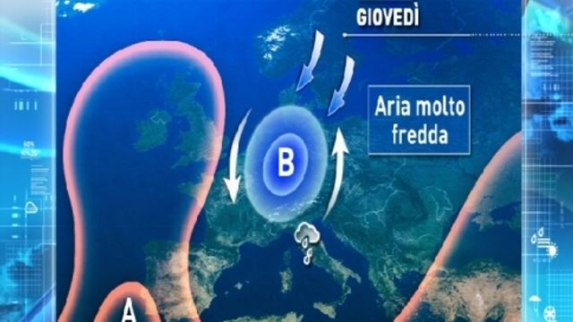 Giovedì in arrivo dal Nord Europa la "goccia fredda"- Giovedì in prevalenza bello lungo il Medio Adriatico e all'estremo Sud, nuvole altrove: piogge diffuse al Nordest, Lombardia e Levante Ligure, anche intense sul Triveneto; qualche acquazzone anche su Toscana, Umbria, Lazio, Campania e Sicilia. Temperature in calo nelle regioni settentrionali a causa della massa d'aria artica proveniente dalla Groenlandia che si addosserà sulle Alpi, provocando nevicate fino ai 1000 metri.