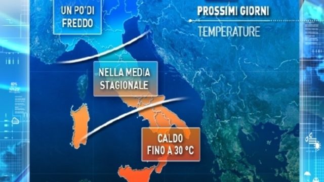 Weekend: inverno al Nord, estate al Sud - Sabato in tutto il Paese nuvolosità molto variabile e irregolare, che lascerà spazio al sole soprattutto in Sicilia. Precipitazioni più probabili al mattino e di nuovo dalla serata su Val d’Aosta, alto Piemonte, alta Lombardia, Trentino Alto Adige e Friuli, nevose sui rilievi tra 1000 e 1200 metri, in rialzo a fine giornata. Al mattino qualche locale piovasco anche tra Marche, Umbria e Lazio; nel corso della giornata locali rovesci o temporali su Campania, alta Calabria, Basilicata e Puglia centrale. Temperature massime in ulteriore aumento all’estremo Sud e nelle Isole, con punte anche sopra i 30 gradi in Sicilia, complici i venti di Scirocco. Clima invernale al Nordovest, con massime intorno ai 10-12 gradi. L’aria fredda proveniente dalla Groenlandia rimarrà intrappolata in Val Padana e, per effetto delle nubi, le temperature rimarranno davvero basse. Domenica sarà una giornata parzialmente nuvolosa al Nord, Toscana e Umbria ma senza piogge mentre sarà più soleggiata al Centrosud specie all’estremo Sud; nelle regioni meridionali in particolare sarà una domenica estiva con temperature tra 26 e 31 gradi.