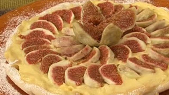 Mettete sulla pasta frolla raffreddata la crema pasticcera. Sbucciate i fichi, tagliateli a fettine, disponeteli sulla torta lasciando un fico intero aperto a stella nel centro e terminate con lo zucchero a velo.
