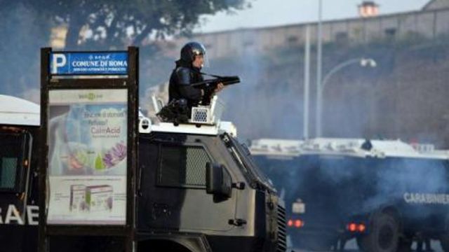 Al corteo degli antagonisti di Roma, dopo un avvio relativamente tranquillo, la tensione è salita quando i dimostranti sono arrivati nei pressi dell'organizzazione di destra Casa Pound, dove sono scattati i lanci di bottiglie contro i blindati delle forze dell'ordine. Secondo gli organizzatori, sono scese in piazza almeno 70mila persone. Alla protesta partecipano studenti, lavoratori, No Tav, e anche tanti immigrati. Duri scontri con la polizia