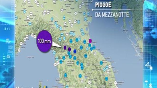 Le previsioni per lunedì - Rovesci e temporali localmente anche forti in Romagna, Toscana, Umbria e Marche; qualche pioggia anche in Emilia, Levante Ligure, Venezia Giulia e alto Lazio. Cielo grigio al Nord, bel tempo nel resto dell'Italia, ma con più nubi su Lazio, Abruzzo e Sardegna. Alla sera torna un po' di pioggia in Lombardia, mentre si attenuano i fenomeni nelle altre zone, ma con ancora il rischio di rovesci tra Toscana e Liguria.