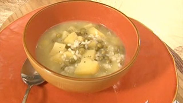 Come prima cosa, sbucciate le patate e tagliatele a dadini. In una pentola con un poco di evo, rosolate della cipolla tritata, poi aggiungete patate, piselli e salate. A poco a poco aggiungete del brodo vegetale caldo.