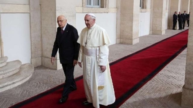 Prima di arrivare al palazzo, il corteo del Papa ha percorso le strade del centro di Roma senza sirene e senza scorte particolari. Non c'erano neanche i corazzieri che in altre occasioni erano soliti accompagnare i pontefici al Colle. Oltre al Presidente della Repubblica, il Pontefice ha anche salutato la delegazione governativa presente per accoglierlo, a cominciare dal premier Enrico Letta, con cui ha avuto un breve colloquio.