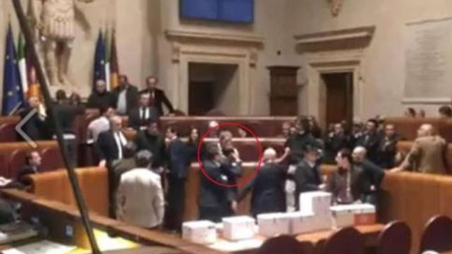 Bagarre in consiglio comunale a Roma dopo che due consiglieri sono finiti alle mani. Protagonisti Dario Rossin (Fdi), che poco prima aveva cercato di raggiungere lo scranno del presidente colpendo involontariamente il sindaco Marino, e Gianluca Peciola (Sel). Rossin ha dato uno schiaffo a Peciola che ha cercato di ricambiare il colpo. La seduta è stata sospesa per diversi minuti. Il sindaco Marino: "La gomitata non era involontaria".