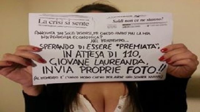 Un decolté in bella evidenza e un messaggio chiaro: “In attesa del 110, giovane laureanda invia le proprie foto”. La segnalazione è arrivata alla redazione di Skuola.net da un genitore di una studentessa, che si interroga: “Le sembra possibile che ci siano annunci del genere in quella che dovrebbe essere la casa della cultura? Per i ragazzi tutto questo sembra essere una cosa normale, sarò mica io l'unico a stupirsi”.