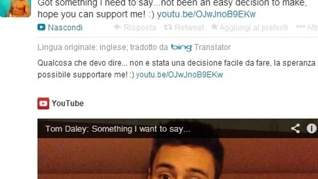 Per lo sport britannico, Tom Daley è una celebrità al pari dei campioni di calcio, rugby e cricket. Da sempre al centro delle attenzioni dei media d’oltremanica, già due Olimpiadi nonostante la giovane età, il 19enne tuffatore di Plymouth ha trovato il coraggio di fare coming out e rilevare a tutti la sua relazione con un uomo. Lo ha fatto con un video, pubblicato sul suo canale YouTube, dal titolo “Something I want to say”.