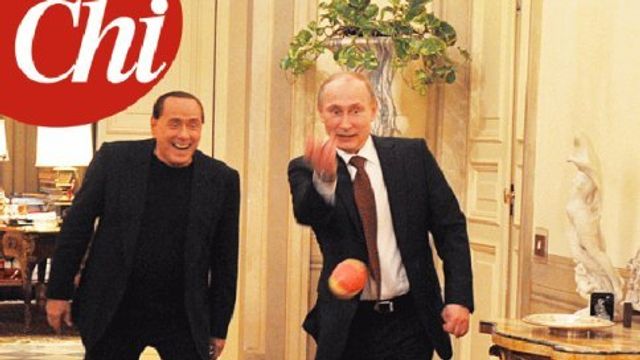 Vladimir Putin lancia la palla per far giocare il cagnolino Dudù, mentre Silvio Berlusconi ride divertito. La fotografia è stata scattata da Livio Articoli a Palazzo Grazioli, a Roma, dove il presidente russo è stato ospite del leader di Forza Italia. E sarà pubblicata in esclusiva sulla copertina del settimanale "Chi" in edicola mercoledì 4 dicembre. Nell'immagine, ecco Putin e Berlusconi che si rilassano nei corridoi della residenza, insieme con il cagnolino di Francesca Pascale.