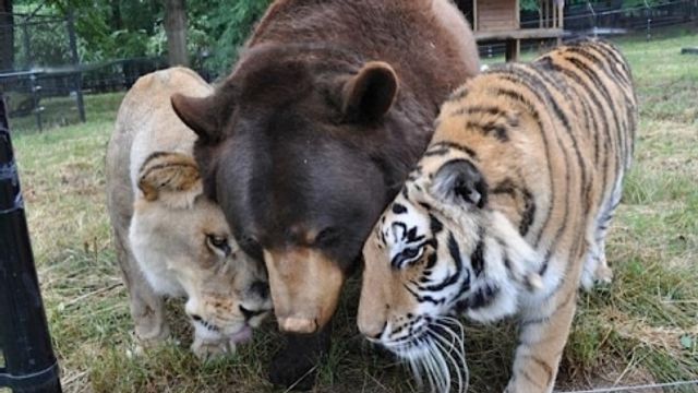 Baloo, Leo e Shere Khan, rispettivamente un orso bruno americano, un leone africano e una tigre del Bengala, erano dei cuccioli maltrattati. La loro vita è cambiata quando sono stati accolti dall'associazione Noah’s Ark Animal Sanctuary in Georgia, Stati Uniti. I tre sono cresciuti insieme come una famiglia e hanno sempre condiviso lo stesso recinto, tanto che oggi, spiegano i volontari dell'associazione a difesa degli animali, è praticamente impossibile separarli.