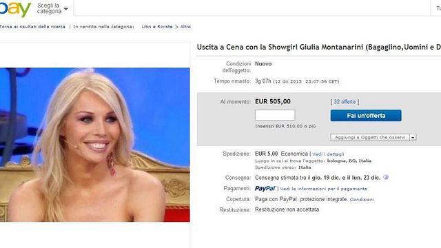 "Uscita a Cena privata, in un Locale di Milano, con la Showgirl GIULIA MONTANARINI! Dopo UOMINI E DONNE con la DE FILIPPI, in cui ha incontrato tanti pretendenti... la BELLISSIMA E SIMPATICISSIMA Attrice, Modella e Showgirl, uscirà a Cena con il Fortunato Vincitore dell'Asta Benefica , in un Locale alla Moda Milanese - si legge nell'annuncio pubblicato su eBay, che precisa - Il Tutto ovviamente...PAPARAZZATI DA UN FOTOGRAFO ;-)".