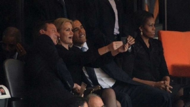"Tutti in posa: al tre scatto". Forse avrà usato queste parole il presidente americano, Barack Obama, che durante la cerimonia di commemorazione per Nelson Mandela ha fatto una foto con il primo ministro britannico, David Cameron, e il premier danese, Helle Thorning-Schmidt. Anche i tre capi di governo hanno dunque ceduto alla mania del "selfie", l'autoscatto che spopola sui social network. Chi pare non gradire è la first lady, Michelle Obama, che resta in disparte e lancia un'occhiataccia al marito mentre parla con la Thorning-Schmidt.