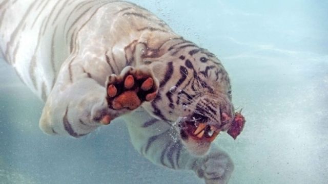 Le immagini della rara tigre bianca del Bengala mentre, affamata, si tuffa nell'acqua dopo aver perso un pezzo di carne nella piscina del "Six Flags Animal Park", nel nord della California. Uno spettacolo imperdibile. Gli scatti dell'esemplare di 272 chilogrami sono stati catturari dalla macchina fotografica di Kristi Harper, di 45 anni.