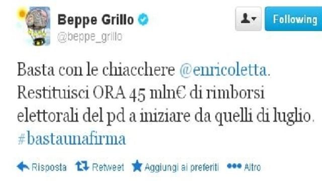 Dal Cdm arriva lo stop al finanziamento pubblico dei partiti attraverso un decreto legge ad hoc. Ma se Enrico Letta, Gaetano Quaglieriello e Angelino Alfano danno la notizia su Twitter affermando di aver "mantenuto la promessa", il leader del Movimento 5 Stelle, Beppe Grillo, li striglia e al premier dice: "Basta parole ora ci siano i fatti: il Pd rimborsi i 45 milioni che ha preso".