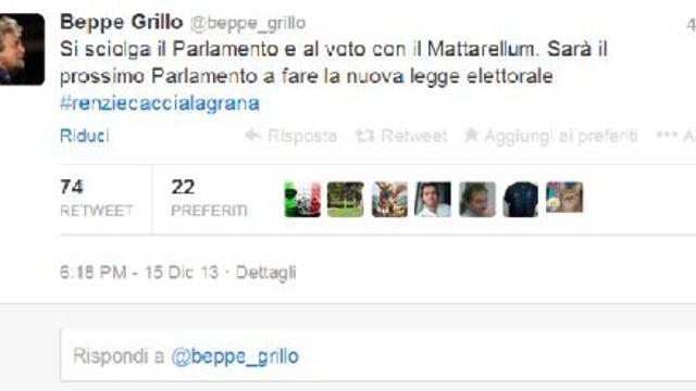 "Si sciolga il Parlamento e al voto con il Mattarellum. Sarà il prossimo Parlamento a fare la nuova legge elettorale". Lo afferma su Twitter Beppe Grillo, che aggiunge l'hashtag "#renziecaccialagrana. Il neosegretario del Pd "aveva annunciato una 'sorpresina'. C'è stata invece solo una scoreggina", ha aggiunto. "I rimborsi elettorali - ha poi ribadito - vanno restituiti agli italiani, non a Grillo".