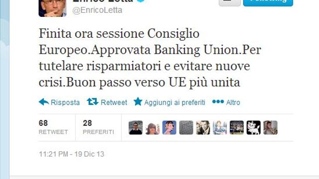 "Finita ora sessione Consiglio europeo. Approvata Banking Union. Per tutelare risparmiatori e evitare nuove crisi. Buon passo verso Ue più unita". Così il premier Enrico Letta, su Twitter, annuncia il grande accordo finanziario. "E' evidente che è un compromesso" e noi speriamo che l'Europarlamento faccia qualche "passo avanti in più".