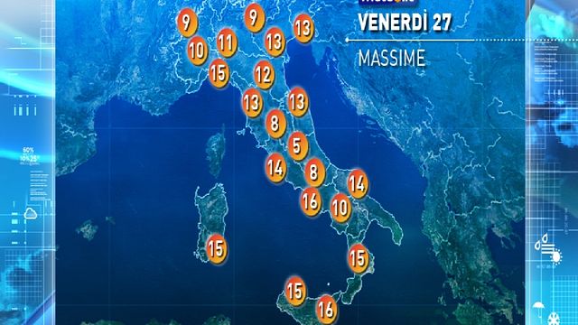 Le previsioni per venerdì - Netto miglioramento in gran parte del Nord Italia con il ritorno di un bel sole al Nordovest e in Trentino Alto Adige mentre in Emilia Romagna e sulle Venezie insisteranno ancora un po' di nuvole con il rischio di qualche pioggia in Romagna. Le schiarite saranno ampie anche sulle regioni meridionali dove qualche pioggia sarà possibile in Puglia e al mattino anche in Sicilia occidentale. Più nuvoloso al Centro specie sul versante adriatico con piogge tra marche e Abruzzo. Temperature pomeridiane in rialzo al Nordovest, Alpi e Sardegna; in lieve calo sul versante adriatico e ionico, stazionarie su quello tirrenico. Venti in attenuazione ma con ancora un moderato Maestrale su Sardegna e Canale di Sicilia.