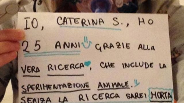 La sua "colpa" è di soffrire di quattro malattie genetiche rare e di essere ancora su questa terra grazie alla ricerca basata sulla sperimentazione animale. E per dire grazie alla comunità scientifica che le permette di svegliarsi ogni mattina e di andare a letto ogni sera, la 25enne ha postato su Facebook e su Twitter una sua foto con un respiratore sulla bocca con l’hashtag #iostoconlaricerca, #iostoconelenacattaneo, ringraziando ricercatori, Sistema Sanitario Nazionale e Agenzia del Farmaco. “Io, Caterina S. - si legge - ho 25 anni grazie alla vera ricerca, che include la sperimentazione animale. Senza la ricerca sarei morta a 9 anni. Mi avete regalato un futuro".