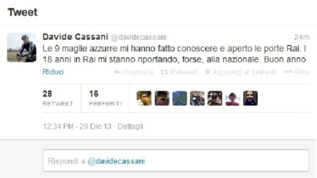 "Le 9 maglie azzurre mi hanno fatto conoscere e aperto le porte Rai. I 18 anni in Rai mi stanno riportando, forse, alla nazionale. Buon anno". Con questo tweet Davide Cassani, ex ciclista e attuale commentatore televisivo, si fa largo tra i candidati alla successione di Paolo Bettini per guidare la nazionale di ciclismo. Il toscano, infatti, ha deciso di diventare team manager della nuova squadra del ferrarista Alonso a partire dal 2015