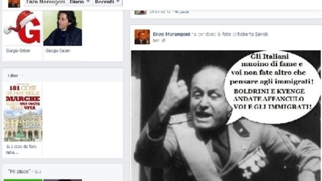 "Gli italiani muoiono di fame e voi non fate altro che pensare agli immigrati! Boldrini e Kyenge andate a fare... voi e gli immigrati!". Una vignetta online in cui Benito Mussolini dice queste parole è stata condivisa dal consigliere regionale marchigiano di Forza Italia, Enzo Marangoni, sul suo profilo Facebook. Sono piovute critiche e contestazioni, soprattutto da parte del Pd, ma Marangoni ha risposto, sempre sul social network, che "i politici devono occuparsi del popolo italiano e solo dopo di tutti gli altri popoli".