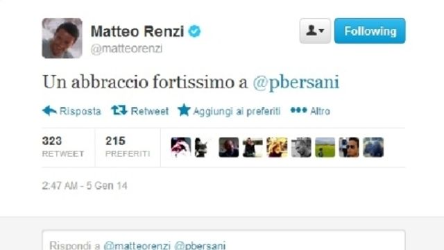 "Un abbraccio fortissimo a Pier Luigi Bersani". Così Matteo Renzi, su Twitter, esprime sostegno all'ex segretario Pd colto da malore. Sempre sul social network vari membri della segreteria, da Pina Picierno a Alessia Morani, incoraggiano Bersani a superare il momento difficile. Anche il presidente del Senato, Pietro Grasso, ha espresso vicinanza all'ex segretario Pd: "Un pensiero e un abbraccio a Pier Luigi Bersani, forza!".