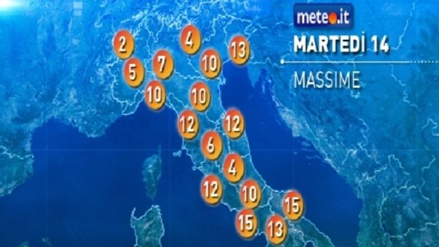 Le previsioni per martedì 14 gennaio - Martedì nuvole su tutta Italia: nel corso del giorno piogge diffuse su tutto il Nord, regioni tirreniche, Sicilia e, a carattere più intermittente e isolato, anche su Marche e Sardegna; nevicate abbondanti sulle Alpi al di sopra di 800-1000 metri.