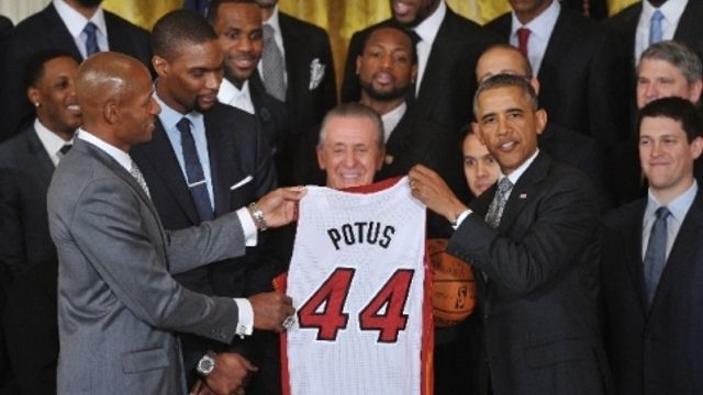 Il presidente americano Barack Obama ha ricevuto alla Casa Bianca la squadra dei Miami Heat, campioni in carica dell'Nba. Lebron James, Ray Allen, Dwyane Wade (presente anche la fidanzata, la famosa attrice Gabrielle Union) e compagni hanno regalato al 44esimo presidente americano - appassionatissimo di basket anche se tifoso dei Chicago Bulls - una canotta degli Heat con la scritta "Potus 44”, acronimo di "President of the United States".