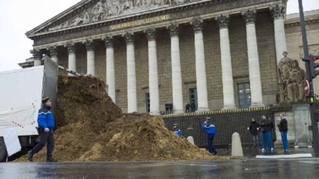 Ha appeso uno striscione con la scritta "Fuori Hollande e tutta la classe politica" sulla fiancata del suo Tir e, dopo averlo riempito di letame, ha parcheggiato il mezzo davanti alla sede dell'Assemblea nazionale a Parigi, svuotando il camion e ammucchiando sulla piazza il maleodorante messaggio. L'uomo è stato fermato dalla polizia parigina.