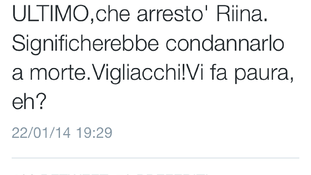 @ritadallachiesa: Sembra abbiano deciso di togliere scorta al CAP. ULTIMO,che arresto' Riina. Significherebbe condannarlo a morte.Vigliacchi!Vi fa paura, eh?