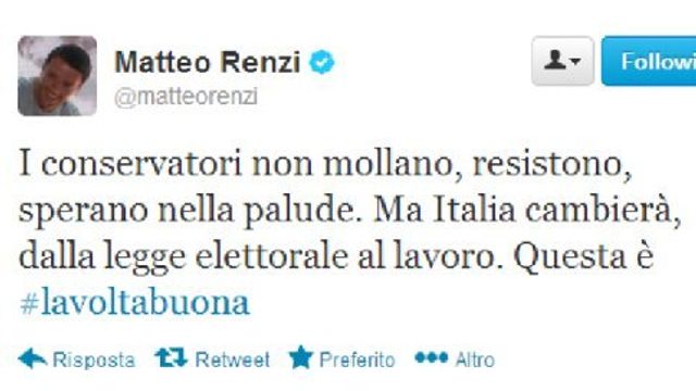 "I conservatori non mollano, resistono, sperano nella palude". Lo scrive su Twitter il segretario del Pd, Matteo Renzi. "Ma l'Italia cambierà, dalla legge elettorale al lavoro. Questa è la volta buona", aggiunge il sindaco di Firenze.