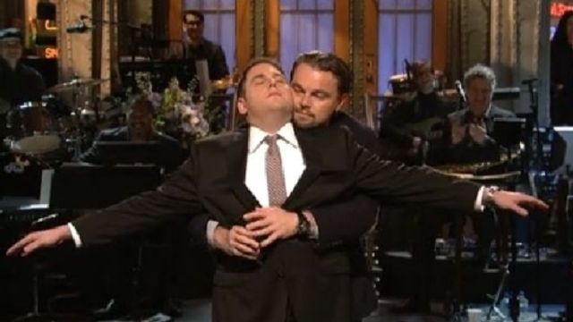 Leonardo Di Caprio prende tra le braccia Kate Winslet e le permette di abbandonarsi capelli al vento sulla tolda del "Titanic". E' la scena simbolo del film che l'attore ha replicato, in chiave comica, al "Saturday Night Live", prendendo tra le braccia il comico Jonah Hill, decisamente meno attraente della Winslet.