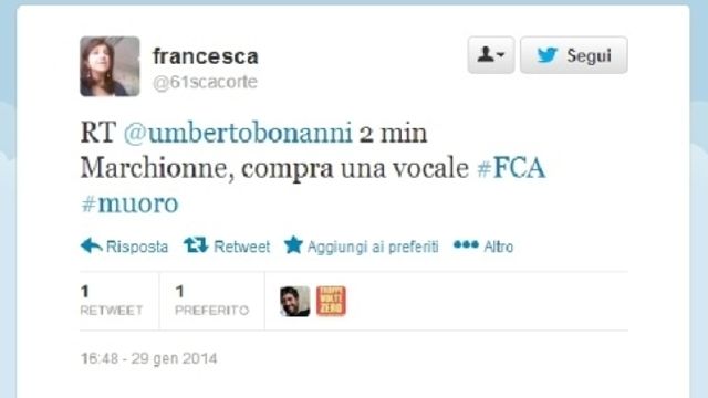 "Marchionne, compra una vocale". La nuova sigla della Fiat, quell'acronimo Fca che sta per Fiat Chrysler Automobiles, ha fatto impazzire il web. Le battute si sprecano e ci vuole poca fantasia per intuire dove vanno a parare. Ma c'è anche chi, con pochi click, ruota la A finale trasformando la sigla in un insulto. Spazio poi a ironie su Lapo Elkann e a freddure sulla scelta, per nulla condivisa dagli utenti di Twitter, dello spostamento in Inghilterra della sede fiscale della società.
