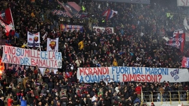 Contestazione ad un simbolo. La curva del Bologna dopo i cori contro i napoletani se la prende con il suo presidente onorario, Gianni Morandi. Chiede di mollare al personaggio che aveva messo faccia e denaro nella società, quando era ad un passo dal fallimento. "Fuori dai m..., a quando le dimissioni?", si domanda provocatorio lo striscione apparso all'inizio dell'anticipo poi perso con l'Udinese. Due settimane fa era stato lo sfregio di 'Caruso', ancora una canzone, ancora di Dalla e coperta dai fischi e dai cori, a far sbottare un moderato come il cantante. Su Facebook, il giorno dopo, aveva scritto che si vergognava. "Fare il presidente onorario - aveva aggiunto - non mi piace più". I tifosi non gliel'hanno perdonata, nonostante il tentativo di pace affidato ieri sempre al social network, quando Morandi si era congratulato con la curva per la raccolta fondi pro alluvionati: all'ingresso in campo, la richiesta di dimissioni e i messaggi, "uno su mille ce la fa a non dire banalità", poi insulti non riferibili, proseguiti durante la partita. Morandi allo stadio non e' stato visto, la società per ora tace